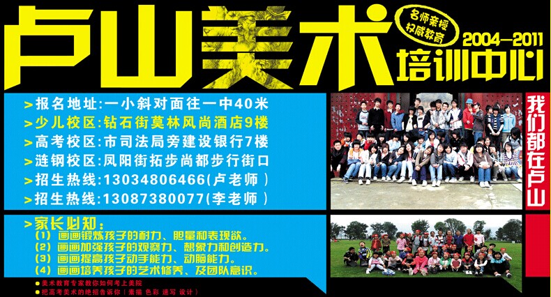 卢山先生从艺、执教十几年,形成了他独特的教学体系,能让学生在有限的时间内,激活自己的艺术细胞,真正领悟艺术的真谛,成为一个绘画高手。由他培养考上各大美院的学生数不胜数,而其弟子们更是活跃在美术的不同专业上,继续为美术教育及艺术创作事业贡献自己的力量。他说:“我们以执着为犁,汗水为露,勤耕不辍,终成大器。”卢山画室以一流的教学环境、先进的教学理念、规范系统的教学体系、优秀的教师队伍立志打造本市美术教育的领军机构。本中心创办以来为全国各大美术院校输送了一大批优秀的学生,赢得了强烈的社会反响。卢山美术培训中心目前已经成为我市高档次、大品牌的美术培训学校。