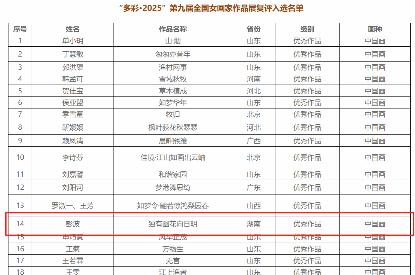 3月8日上午,在第 115个“三八”国际妇女节来临之际,由中国女画家协会、山东省文学艺术界联合会、山东省妇女联合会主办的“多彩·2025”第九届全国女画家作品展在威海市美术馆开幕。本次展览共收到来自全国32个省级行政区的女性艺术家们4000余件参评作品,经过评委严格、公正的评审,最终评选出入选作品200件,其中优秀作品60件,涵盖中国画、油画、水彩·粉画、版画、综合材料、雕塑等。我院美术学专业教师彭波的中国画作品《独有幽花向日明》喜获“优秀作品”奖(最高奖),体现了我院教师扎实的绘画创作水平。