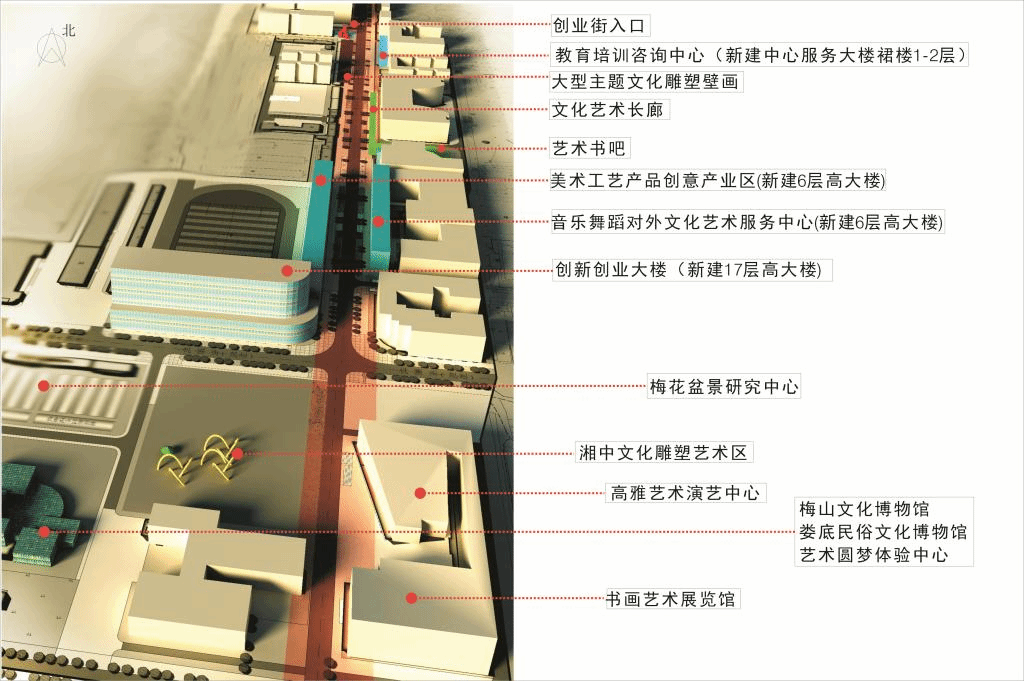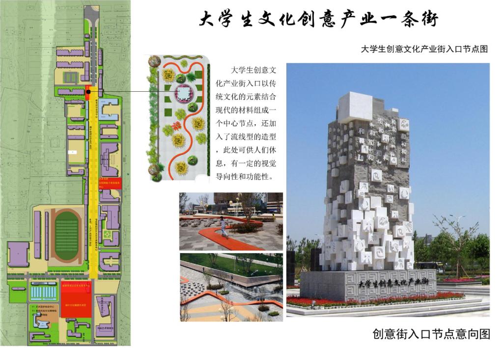 将学院路伸入学校地段(北面阳光公寓入口至南面南佳苑入口)改造建设为文化功能完善、文化品位凸显的集艺术欣赏、书画展览及收藏、文化教育培训咨询、文化创意赛事活动、艺术品线上线下交易为一体的众创空间。