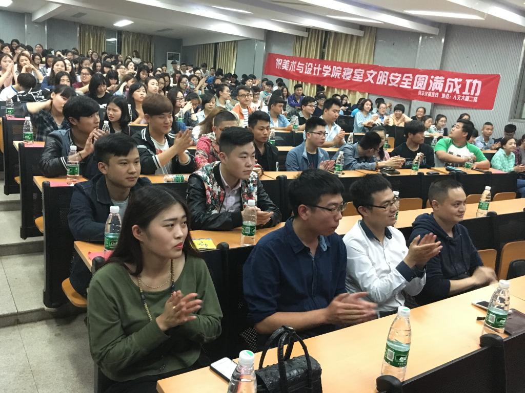 2016年5月19日下午7点30分,由美术与设计学院学生会主办、学生会文教站承办的“寝室文明安全月颁奖晚会”在逸夫楼报告厅成功举行。出席参加此次颁奖晚会的有我院王东光副书记、分管学生会陈天佑老师、我院主席团及各部门部长、各院文建部长以及我院15级各班级等。