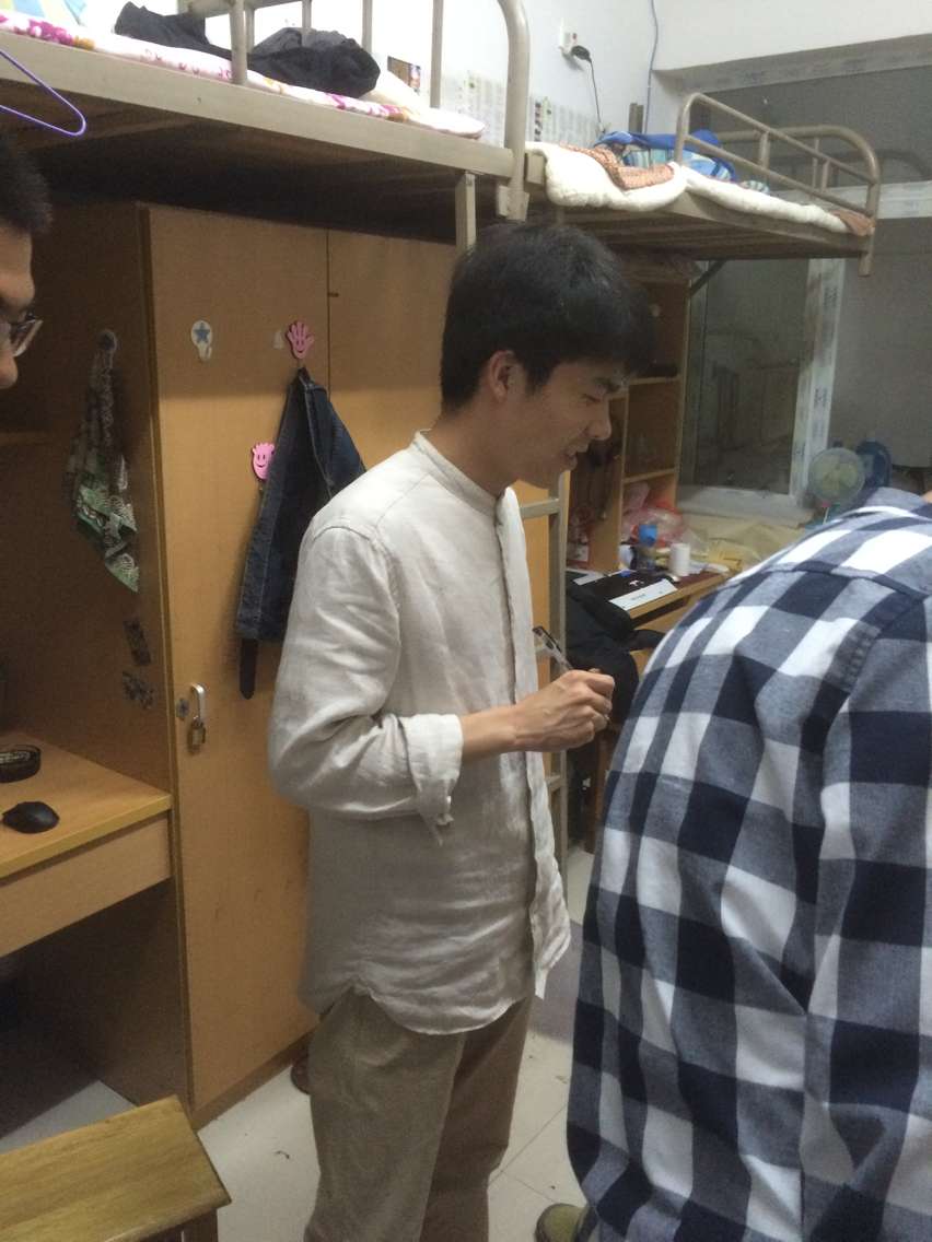 今晚大雨滂沱。当领导及老师顶风冒雨来到学生的寝室时,学生们有的在休息,有的还在收拾行李,他们见到领导和老师们之后,热情招待,并与领导、老师们热情地交谈,寝室里不时传来欢声笑语。