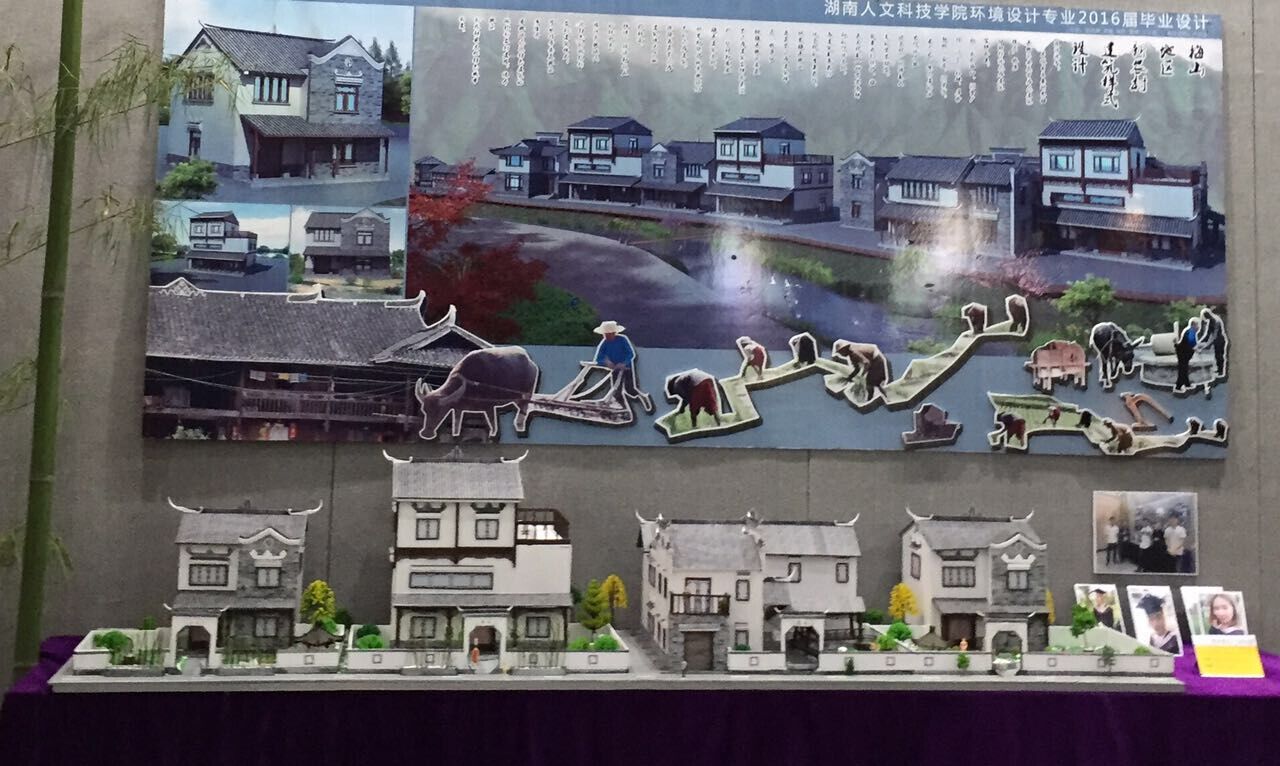 同学们以人文素养、综合知识、创新观念与专业技能,设计了实际项目或前沿虚拟项目,展示了师生对环境设计的艺术与科学、功能与智能、生态与可持续发展、设计与人性关怀等不同层面的探索诠释。代表作品有:梅山文化新农村建筑式样探究,娄底城市广场的商业街景观规划,人文科技学院文化街创意项目,校园文化景观小品改造,屋顶花园空间设计,御景湾售楼部设计,名族风情的土竹屋餐饮空间,现代品牌店面设计,“一树一屋”生态幼儿园设计,古朴书香的棋缘山庄,电影文化咖啡吧,乐开口面包店设计,“回爱”养老院设计等。