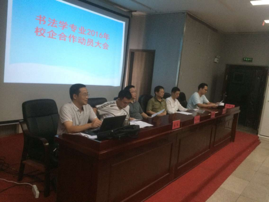 6月6日19:30,美术与设计学院书法学专业2016年校企合作动员大会于逸夫楼一楼报告厅召开。大会由书法学专业副教授彭建成主持,党总支书记李小林、院长邹少灵、副院长陆序彦、书法教研室主任易俊出席大会,带队老师刘风雪、蒋传存、蒋全顺及书法学专业全体肄业生学生参加本次大会。