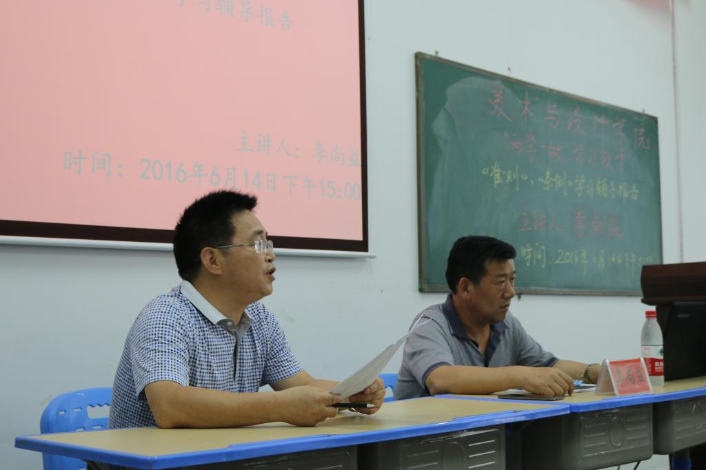 为推进“两学一做”学习教育,6月14日下午3::00,美术与设计学院在逸夫楼美设楼310多媒体教室举行“两学一做”学习教育报告会,邀请原校党委副书记李尚益作关于《中国共产党廉洁自律准则》、《中国共产党纪律处分条例》学习辅导报告。院党总支书记李小林主持报告会,学院全体教职工党员、学生支部支委人员参加了学习。