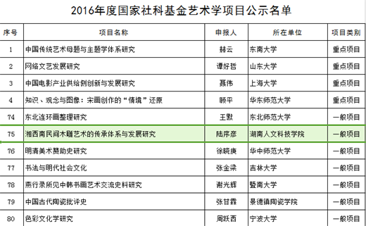 日前,根据全国艺术科学规划办公室颁发的相关文件通知,我院副教授陆序彦申报的《湘西南民间木雕艺术的传承体系与发展研究》项目(编号16BF075)获得国家社科基金艺术学项目立项。该项目重点研究木雕传承人个案、木雕的功能、渊源与流变及其在农村生活中的应用和发展关系。