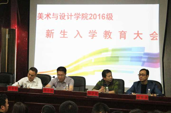 为让新生更好地了解美术与设计学院,更快融入大学生活,2016年10月9日晚,我院2016级新生入学教育大会在逸夫楼报告厅隆重举行。我院院长邹少灵、党总支书记李小林、副院长谢雅强、副书记王东光出席了本次教育大会,各教研室主任,学工办、教务办、行政办所有成员,新生班主任以及全体新生参加了会议。