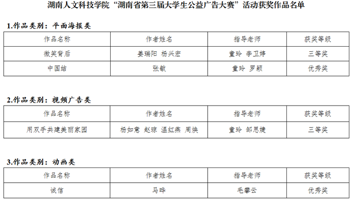 根据《关于开展湖南省第三届大学生公益广告大赛活动的通知》(湘教工委通〔2016〕18号),省文明办、省委教育工委、省教育厅于2016年3月—2016年11月联合举办了湖南省第三届大学生公益广告大赛。