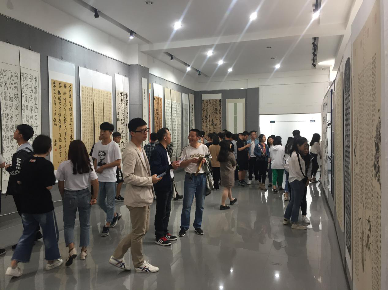 5月10日上午,“理·识:beat365英国官网2018届书法学专业毕业作品展”在学院逸夫美术展览馆举行。教务处副处长邓敏超、娄底市全民读书会会长刘莉华、娄底市书法家协会创作委员会秘书长、河北美院特聘教授贺向阳、学院院长邹少灵、书记谢光绎、副院长陆序彦以及书法学专业师生、校内外书法爱好者两百余人参加了开幕式。
