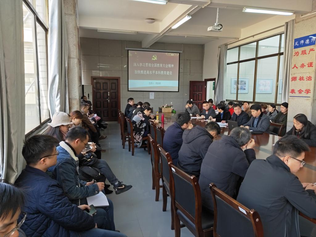 为了深入学习贯彻落实全国教育大会精神,推进高水平应用特色学院建设,11月27日下午,美设学院召开全体教职工大会,专题学习研讨全国教育大会精神,学校党委委员、副校长周发明教授参会,并为全体教职工作了题为《深入学习贯彻全国教育大会精神加快推进高水平本科教育建设》的辅导报告。