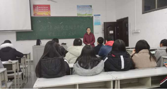 接着,蒋全顺主任对考研学生应对考试做了重要指导。提醒大家一是要及时打印准考证,妥善保管身份证与准考证。二是要冷静分析,认真审题,注意时间分配。三是遇到一些突发状况一定要及时与老师联系。并结合自己考试的经历和近年来组织学生考研的经验,热情地为同学们解答难题。