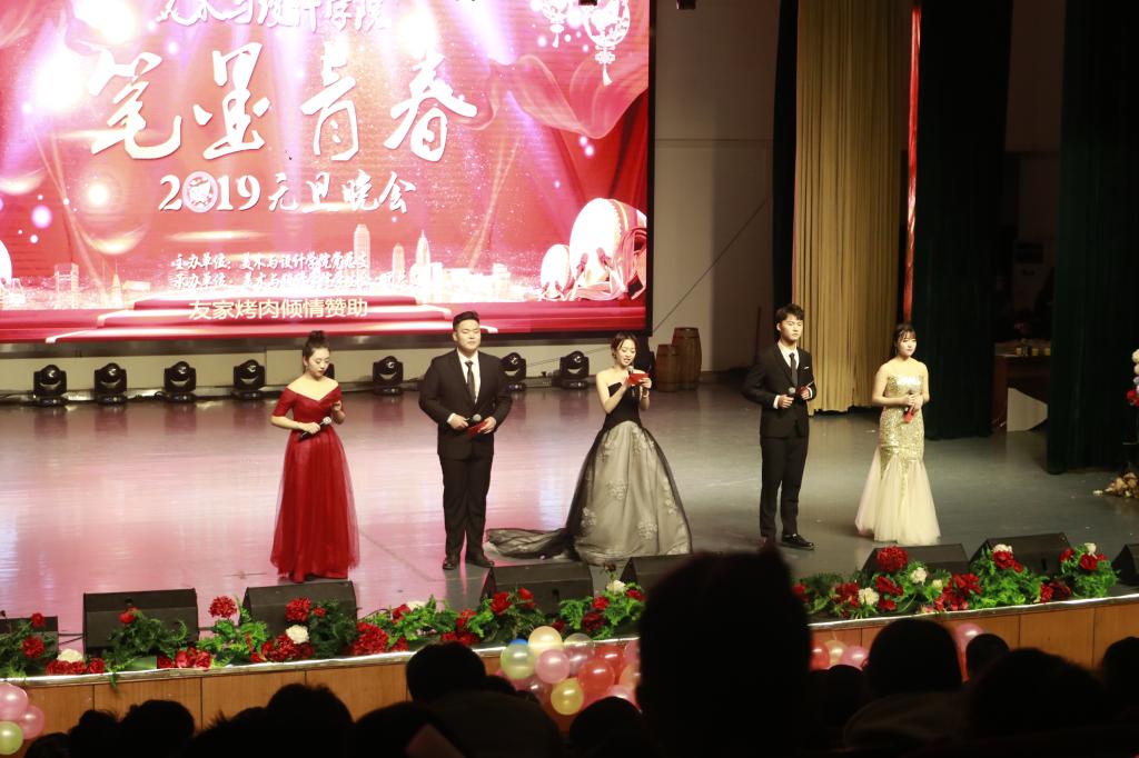 晚会在极具活力的舞蹈《Dance Party》中拉开序幕,学院党总支书记谢光绎发表了热情洋溢的新年致辞。谢书记回顾了学院在2018年取得的瞩目成绩,希望大家再接再厉,共创美设院美好明天,并向全体师生表达了诚挚的问候和新年美好的祝愿!情景剧《青柠》贴近大学生生活学习,展示了大学生青春年华;“人文颂”&现场书法创作节目中,易添顺等同学泼墨挥毫,用笔墨抒写青春,弘扬传统文化;小品《你的模样》、《父亲》将观众带入了感人的情境,许多观众流下感动的泪水;喜剧《倩女不幽魂》则引爆了大家的笑点,乐翻了全场;老师们呈现的汉服秀《国家宝藏》引起了台下观众热烈的反响,将晚会活动推向高潮。吴扎拉涛教授经典歌曲《鸿雁》,让观众近距离的感受到了艺术殿堂的大师风采。晚会在歌声中完美落幕。