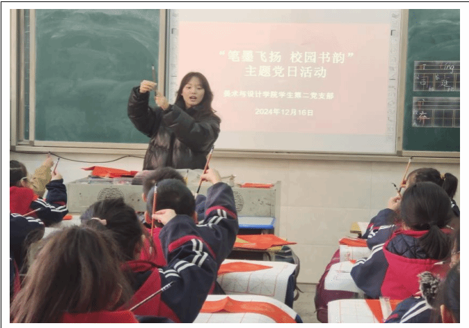 为深入学习贯彻习近平新时代中国特色社会主义思想,积极培育和践行社会主义核心价值观,12月16日美术与设计学院党总支组织学生党支部党员前往长井小学开展“笔墨飞扬,校园书韵”特色主题党日活动。此次活动旨在通过向小学生们介绍春联的历史、文化和书写技巧,激发他们的学习兴趣,传承和弘扬中华优秀传统文化。