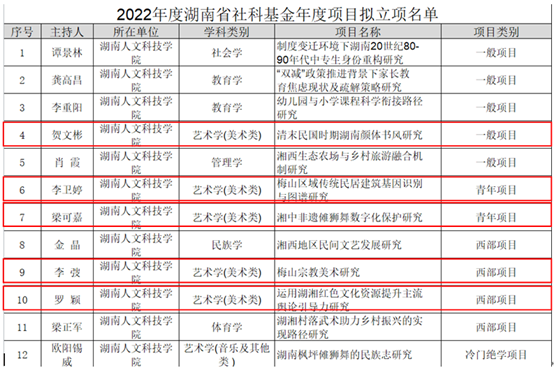 2月3日,湖南省哲学社会科学规划基金办公室公示了2022年度湖南省社科基金年度项目拟立项名单,我院教师贺文彬主持的《清末民国时期湖南颜体书风研究》获批为一般项目,李卫婷主持的《梅山区域传统民居建筑基因识别与图谱研究》、梁可嘉主持的《湘中非遗傩狮舞数字化保护研究》2项获批为青年项目,李弢主持的《梅山宗教美术研究》、罗颖主持的《运用湖湘红色文化资源提升主流舆论引导力研究》2项获批为西部项目。