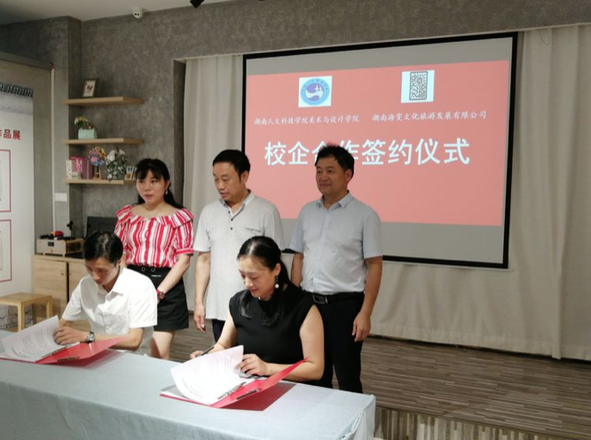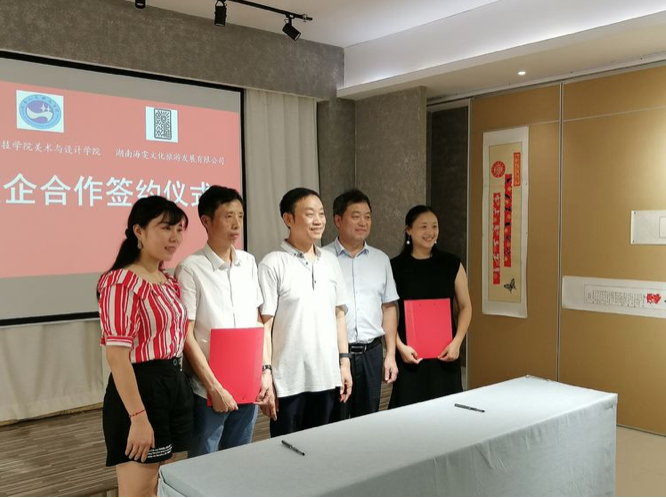 7月12日下午3时许,beat365英国官网美术与设计学院与湖南海雯文化旅游发展有限公司共建“非遗产品研究中心”合作签字仪式在海文非遗馆举行。项目旨在通过校企合作,保护和传承非遗文化,打造非遗文化产业发展新模式。湖南红色文化研究院副院长、湖南会展经济所所长、智库专家李伟智,beat365英国官网美术与设计学院党总支书记谢光绎、副院长陆序彦、环境设计教研室主任谭娟、湖南海雯文化旅游发展有限公司董事长、海文非遗馆馆长黄海文出席。