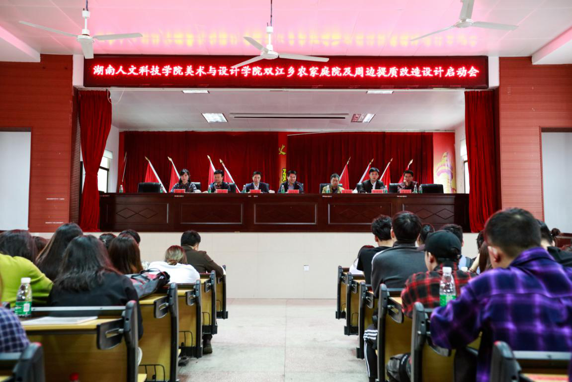 5月15日下午,我院在娄底市娄星区双江乡人民政府会议室开展双江乡农家庭院及周边人居环境提质改造设计项目启动会。校党委委员、副校长周发明,院党总支书记谢光绎、副院长陆序彦,校地校企合作处副处长周卫军,双江乡党委书记罗建湘、乡长刘剑平,环境设计专业教研室主任谭娟等出席启动会。环境设计专业 2016 级全体学生及指导老师参加了启动会,启动会由刘剑平主持。