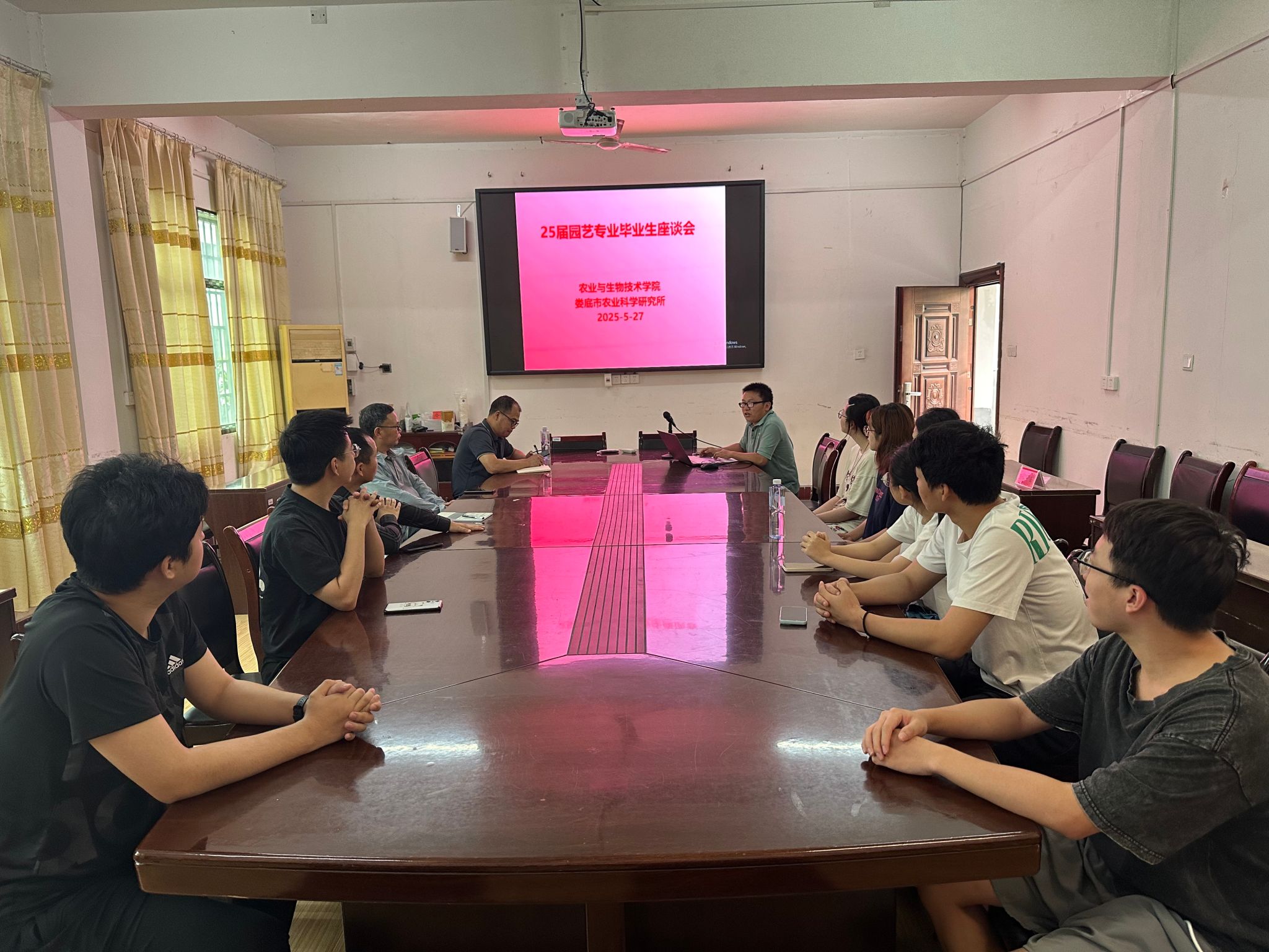 为深入贯彻中央八项规定精神,进一步推进作风建设,切实加强与毕业生的沟通交流,开展就业指导帮扶,促进院所学科专业发展,5月27日下午,农生院(农科所)在强毅楼309室举行了2025届园艺专业毕业生座谈会。学院教学副院长刘泽发、班主任、专任教师及毕业生代表共同参会,会议由园艺教研室主任龚意辉博士主持。
