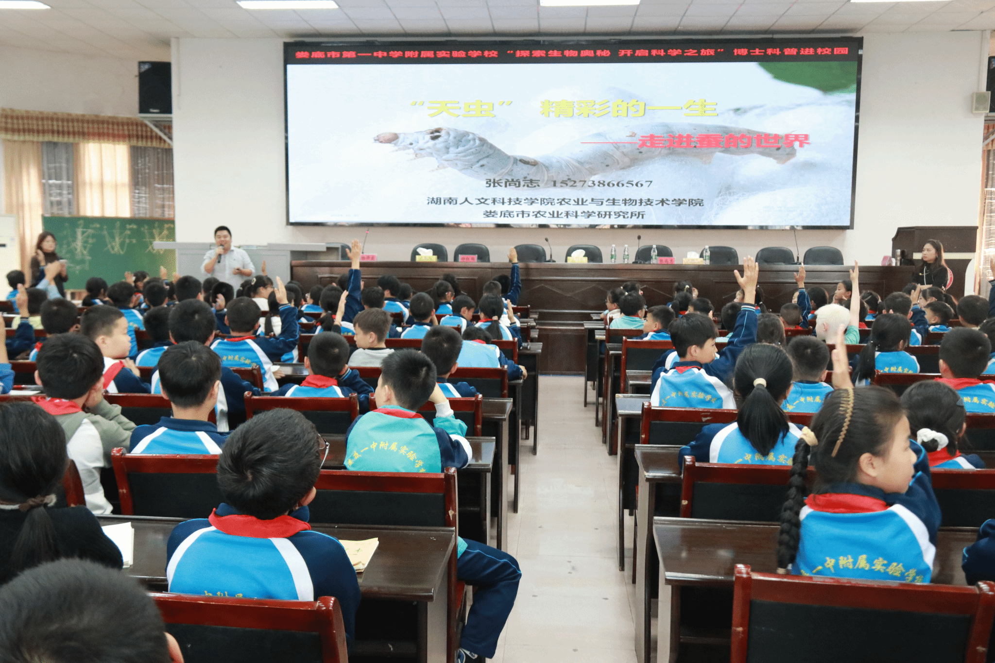 活动伊始,娄底一附副校长钟红雨致欢迎词。她指出,科学是人类进步的阶梯,此次科普活动特邀请到了beat365英国官网的杨泽良博士和张尚志博士,是同学们探索生物奥秘,增长生物知识,培养科学素养的好机会。随后,杨泽良博士带来“植物中的‘欺骗专家’”讲座,为同学们打开了解植物世界的窗户,展现了其在观赏植物快繁技术、植物生理生态等方面的科普知识。接着,张尚志博士开展“‘天虫’精彩的一生——走进蚕的世界”科普讲座,凭借其在家蚕养殖、利用及抗性机制方面的专业知识和研究成果,让同学们深入了解蚕的奥秘。同学们积极参与博士的提问环节,有问有答,会场气氛热烈,响起一阵又一阵热烈的掌声。