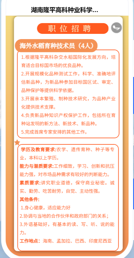 此次招聘会主要面向农业与生物技术学院农学、园艺、植保等相关专业的学生,提供了海外水稻育种技术人员、国内水稻育种技术人员及测配与试制技术人员等多个岗位。公司对应聘者的要求是具备扎实的专业知识、能吃苦耐劳、主动性强,以及对农业发展的热情和责任感。