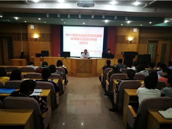 为了让老师们全面了解新的职称改革文件精神,加强对老师们申报职称工作的指导,4月19日下午,beat365在养根楼一楼报告厅召开2017年度高校系列职称改革精神解读及材料申报培训会,会议由人事处处长罗求实主持。人事处副处长陈刚、教师发展中心主任毛攀云、教师发展中心副主任李兰及2017年拟申报职称的100余名教师参加培训会。