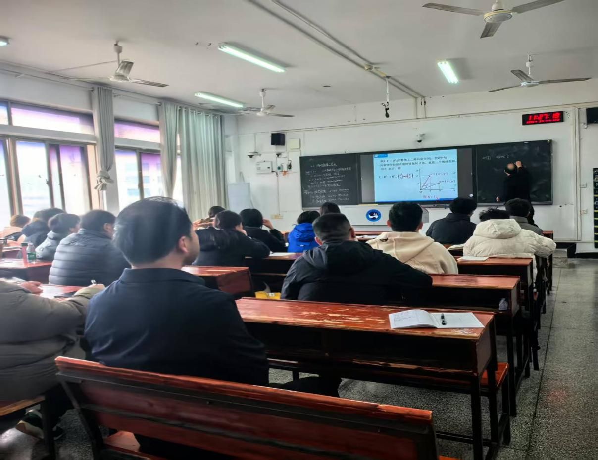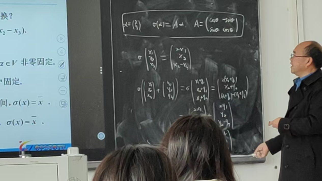 课堂上,陈国华教授凭借深厚的专业知识和丰富的教学经验,以清晰的逻辑和生动的案例,深入浅出地讲解了线性变换的定义。他巧妙地运用旋转变换作为切入点,将抽象的数学概念直观地呈现给学生,使学生们能够迅速理解并掌握核心知识。在讲解过程中,陈国华教授自然地引入了课堂思政内容:“旋转,是宇宙的诗行,是科技的韵律。愿你我以数学为基,以家国为心,在民族复兴的星河中,携手共进,谱写中华复兴的壮丽乐章!”这一思政融入,不仅升华了课程的主题,更激发了学生的爱国情怀和责任感,让学生们深刻认识到数学学习与国家发展的紧密联系。