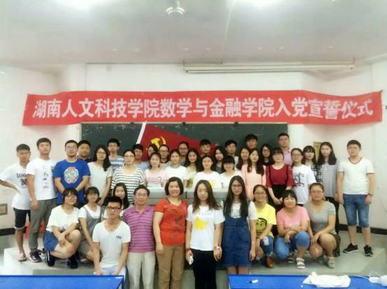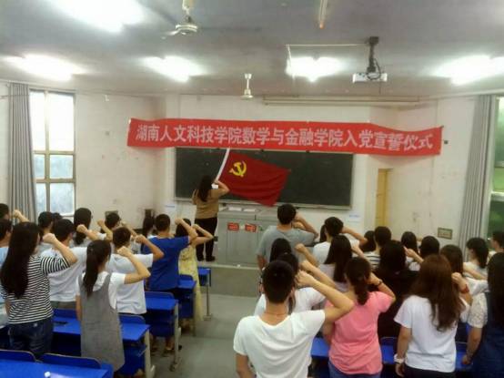 ,数学与金融学院信计与金融工程学生党支部与数学与应用数学学生党支部在致远楼120教室举行了庄严的新党员入党宣誓仪式。数学与金融学院党总支高平书记、周兰副书记、学生党支部书记张蔚、史卫娟,13名学生党支部正式党员和25名预备党员参加了此次宣誓仪式。仪式由学生党支部书记史卫娟主持。