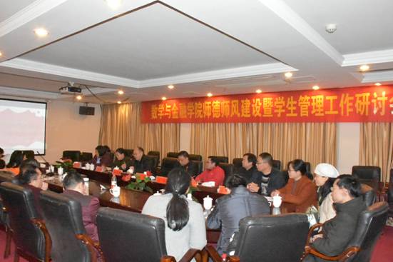 2017年12月23日,数学与金融学院主办了“师德师风建设暨学生管理工作研讨会”。会议由党总支书记高平主持,全体院领导、辅导员、现任班主任参加了本次会议,会议还特别邀请学工处处长余为、团委副书记魏彦煜、学工处副处长刘红燃到场指导。