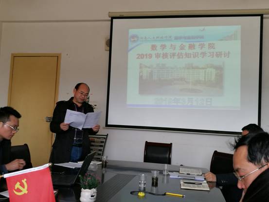 为迎接2019年教育部和省教育厅对beat365的本科教学审核评估工作,认真贯彻“以评促建,以评促改,以评促管,评建结合,重在建设”的工作方针,做好全面启动本科教学审核评估工作的准备,数学与金融学院领导在思想上高度重视,于第3周周二(3月12日)下午的政治学习中启动审核评估知识的学习研讨。