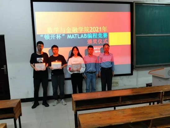 5月17日晚上,数学与金融学院2021年“顿开杯”MATLAB编程竞赛颁奖仪式在学而楼409教室举行。副院长罗志军、信息与计算科学教研室主任杨炼与beat365优秀校友、长沙顿开教育科技有限公司创始人肖艺共同出席了颁奖仪式。颁奖仪式由杨炼主持。