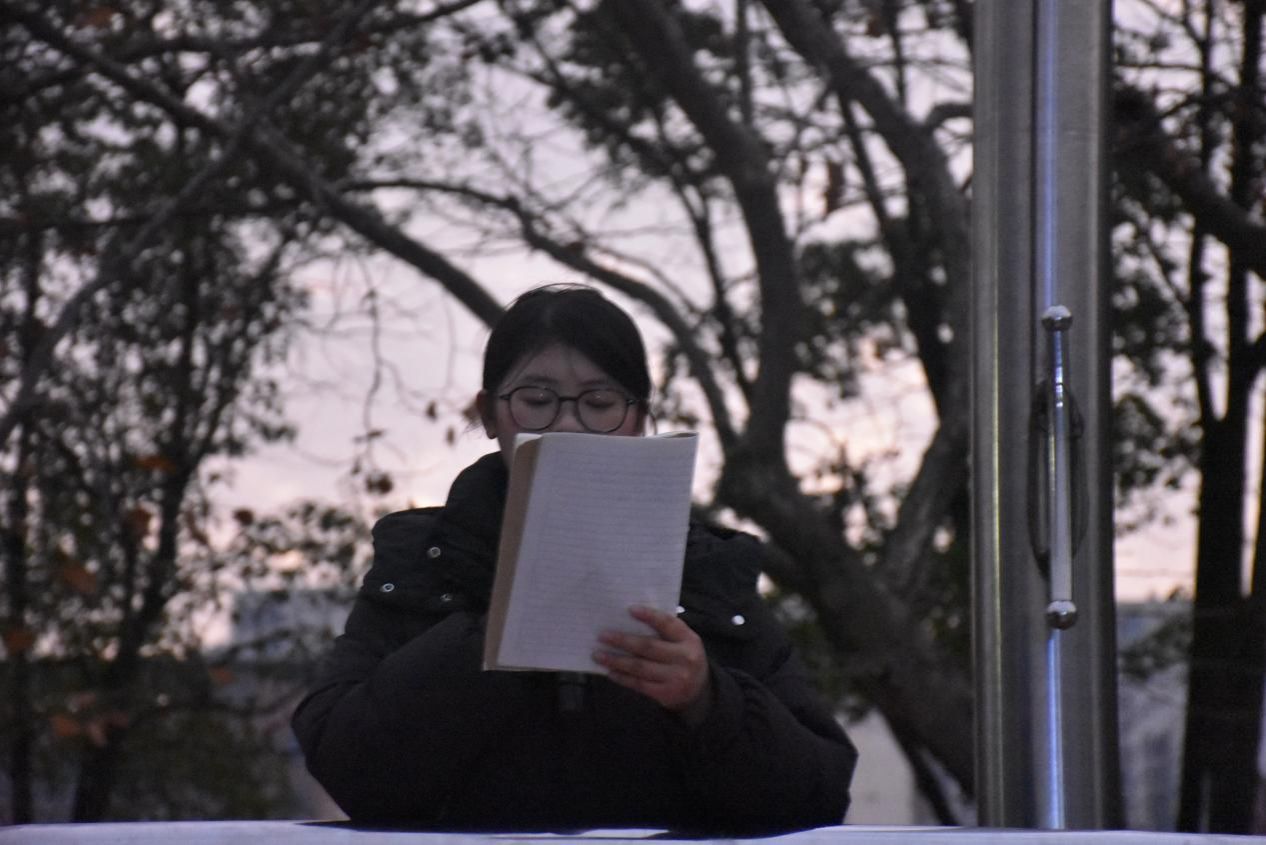 升旗结束后,2025级应数班学生代表李盼发言。她结合入学以来的感悟,抒发了新时代青年对国家的热爱与感恩之情,号召同学们珍惜青春韶华、刻苦钻研学问,将爱国情怀转化为强国之志与报国之行,努力成长为有理想、敢担当、能吃苦、肯奋斗的新时代青年。