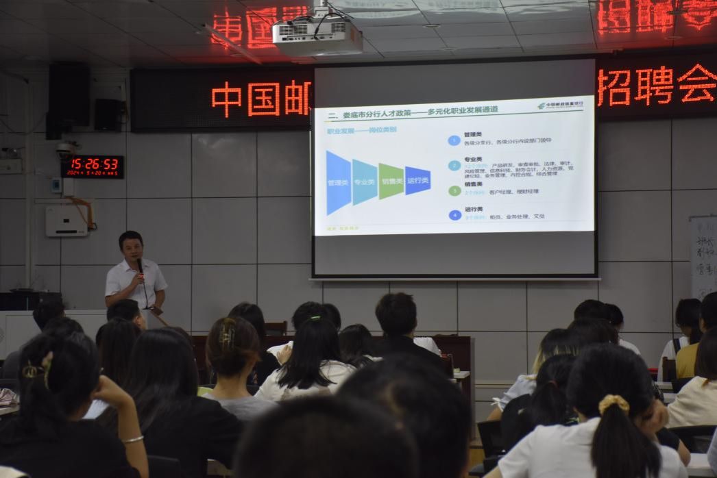 宣讲会伊始,廖经理为同学们介绍了中国邮政储蓄银行的发展历史,对目前的业务经营状况做了简要介绍,并对入职中国邮政储蓄银行的相关待遇进行了解读。
