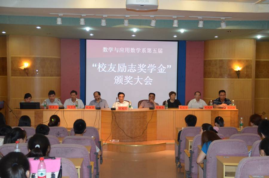 2013年5月28日(星期二)下午,在养根楼多媒体报告厅举行了数学与应用数学系第五届曹翰文校友励志奖学金颁奖大会,莅临本次大会的有湖南鹏泰控股集团、娄底翰林集团公司副总裁兼执行董事曹翰文先生、副校长蒋建初教授、数学系主任陈国华教授、数学系副书记谭本远教授、校友办夏永全主任、招生就业处刘志伟副处长、学生工作处鄢凤明副处长、数学系副主任李炳君博士等。数学系校友励志奖学金是2009年在我系优秀校友曹翰文先生的倡议下成立的,每年在数学系资助8-10名优秀贫困学生,他以此抛砖引玉,倡议更多的校友投入到回报母校的工作中来。