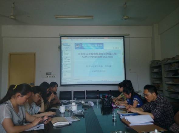 2015年 5月19日下午3点,我系李军成博士在致远楼413作了一场题为《非多项式参数曲线曲面在图像压缩与放大中的建模理论及应用》的学术报告,报告由系主任陈国华教授主持,数学系部分领导和全体青年教师聆听了报告。