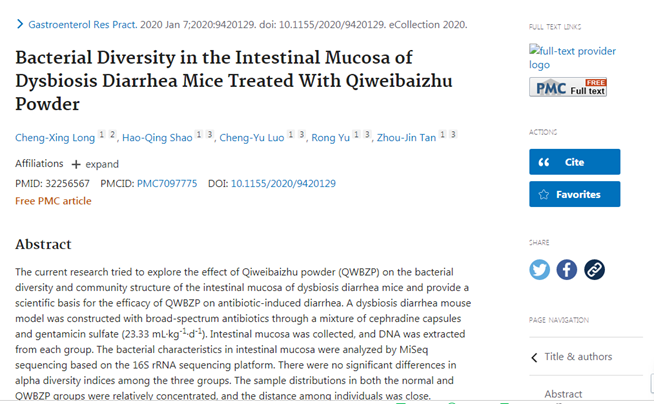 龙承星博士以第一作者在期刊《Gastroenterology Research and Practice》(中科院SCI四区,IF:1.94)2020年第1期上发表题为《Bacterial diversity in intestinal mucosa of dysbacterial diarrheamice treated with Qiweibaizhu powder》的研究论文。本研究选择黏膜这一菌群定植相对稳定、不易受外界因素影响的环境,从肠道黏膜菌群多样性及其群落结构组成情况进一步探讨七味白术散对菌群失调腹泻的疗效。结果表明,抗生素破坏小鼠肠道黏膜细菌结构,多样性降低,七味白术散有助于小鼠黏膜细菌结构的修复和黏膜菌群的恢复。这一结果将为中药干预肠道菌群改善肠黏膜屏障提供更有力的证据,也会为临床消化疾病的治疗与预防带来福音。