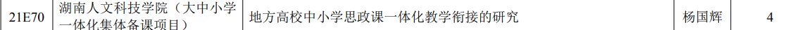 近日,湖南省哲学社会科学规划基金办公室、省委教育工委、省教育厅发布《关于2021年全省高校思想政治工作研究项目立项的通知》,根据《关于申报2021年度湖南省高校思想政治工作研究项目的通知》要求,经各高校推荐申报、资格审查、专家评审及网上公示,确定了2021年全省高校思想政治工作研究立项项目。据悉,我院副院长杨国辉主持的思想政治理论课教研专项项目(大中小学一体化集体备课项目)《地方高校中小学思政课一体化教学衔接的研究》,陈灿芬教授主持的思想政治理论课教研专项项目《供给侧改革视域下高校思政课教学质量提升策略研究》两项项目成功获得2021年全省高校思想政治工作研究立项。