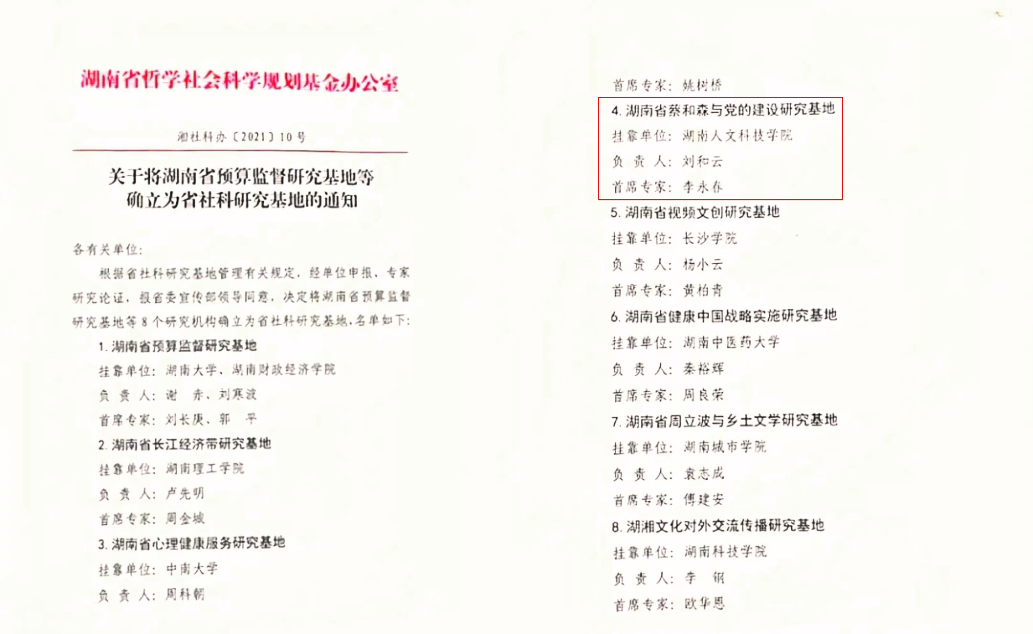 近日,湖南省哲学社会科学规划基金办公室发布《关于将湖南省预算监督研究基地等确立为省社科研究基地的通知》,根据省社科研究基地管理有关规定,经单位申报、专家研究论证,报省委宣传部领导同意,beat365“蔡和森与党的建设研究基地”成功获批为湖南省社科研究基地。