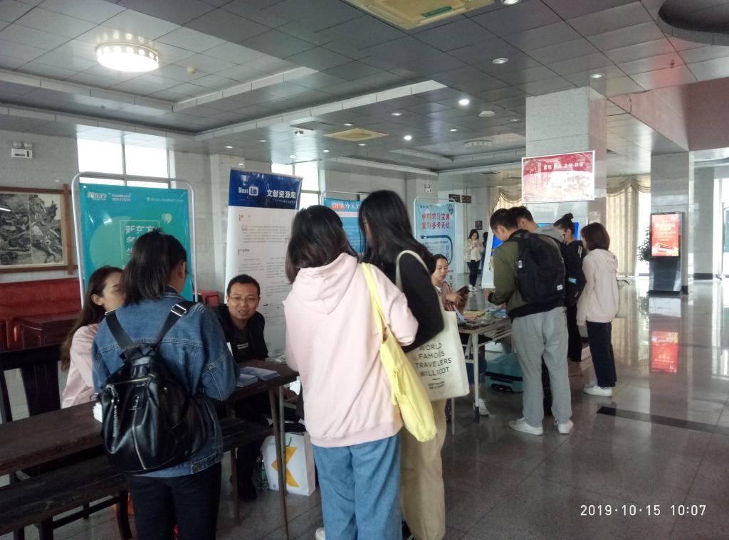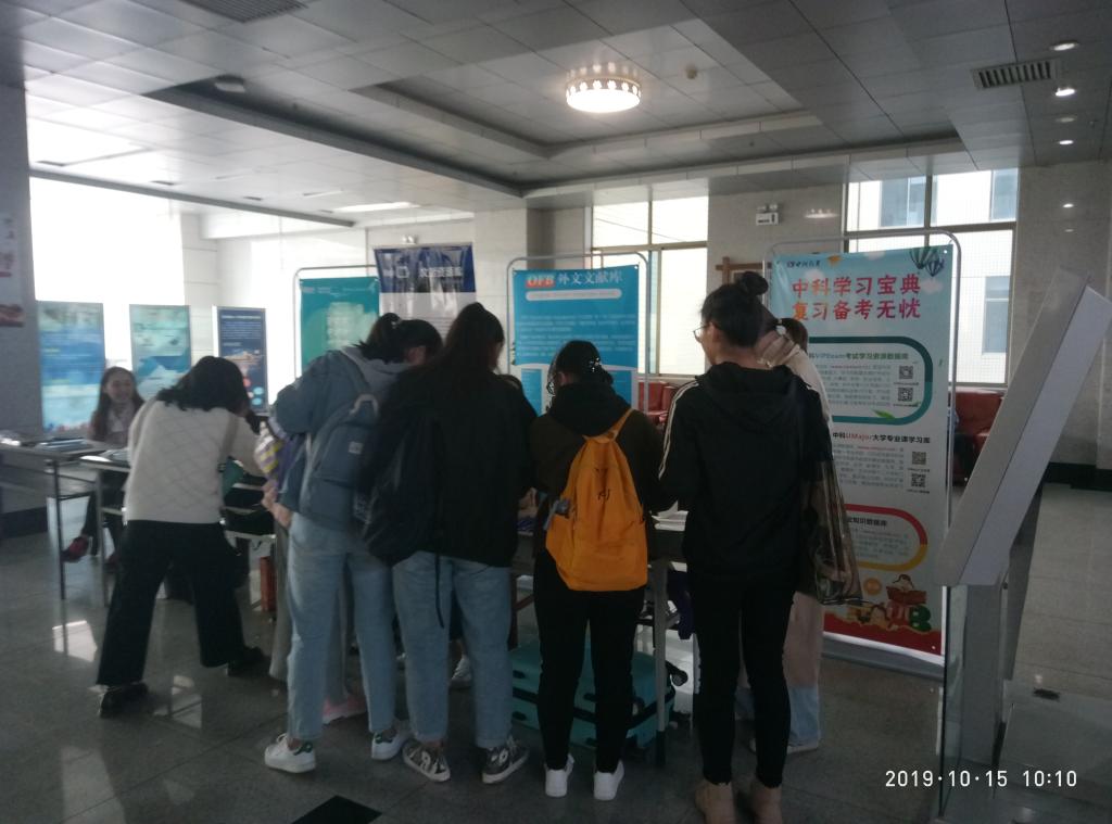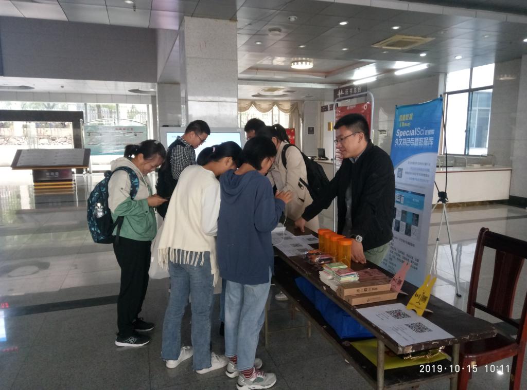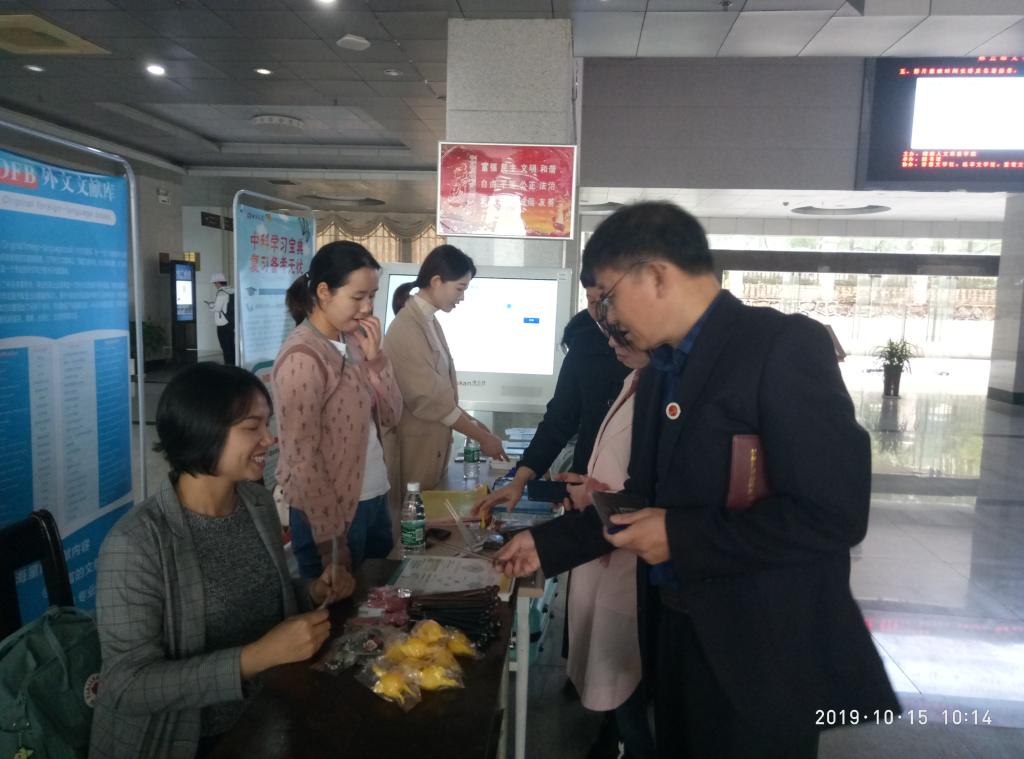 10月15日,图书馆在大厅组织开展了馆藏数字资源宣传推广活动。本次活动是图书馆2019年度数字资源宣传推广月系列活动之一。