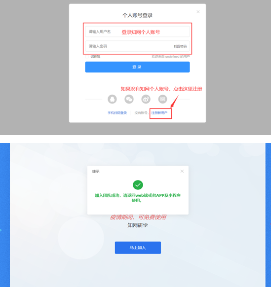 加入团队成功后,就可以在校外免费使用知网研学网页端(网址:x.cnki.net)、手机端(知网研学APP和小程序)和桌面端(知网研学 E-study)。