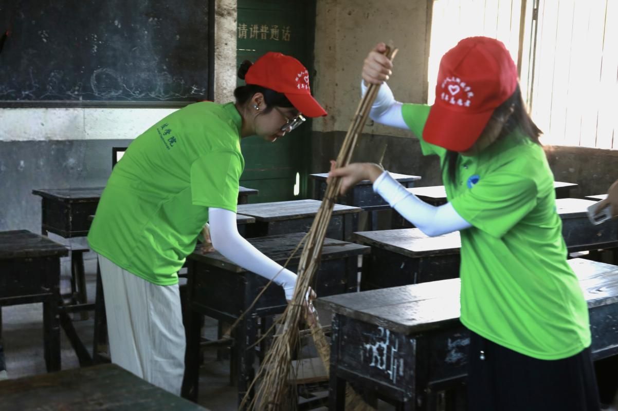 抵达灌溪学校,志愿者们立即投入校园环境整治。教室区域,队员分工擦拭桌椅、清扫地面、清运垃圾;操场区域,另一组队员头顶烈日,清除杂草、整治荒土。汗水浸透衣衫,使得校园焕然一新。