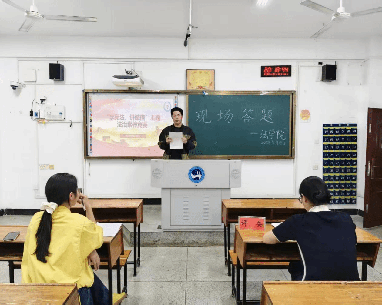 比赛分为笔试与现场答题两个环节。笔试中,选手们专注答题,监考人员严格履职,现场秩序井然。收卷后,现场答题环节拉开帷幕,选手轮流抽取题目,在1分钟准备时间内迅速构思,随后围绕法律问题展开阐述。他们逻辑缜密,部分选手还结合社会热点案例深入分析,充分展现了扎实的法治知识储备与出色的应变能力