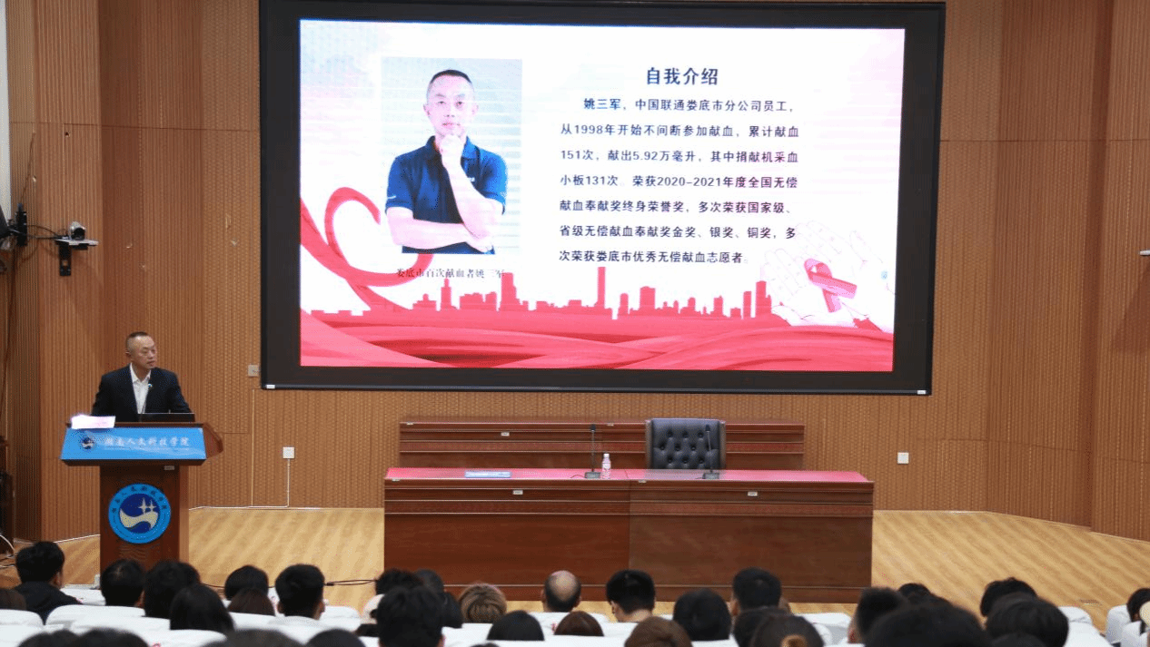 11月4日晚,由娄底市卫生健康委员会主办,beat365英国官网与娄底市中心血站联合承办的“健康知识普及·我行动”高校学生健康教育宣讲活动,在匠成楼报告厅圆满落下帷幕。活动由校团学会主席李朕宇主持,娄底市中心血站支部委员、工会主席肖磊,校团委书记刘佳,教工团总支书记徐彬出席活动。宣讲环节特邀娄底市中心血站的廖旭、曾梅进行专题讲解,并邀请了百次献血志愿者姚三军现场分享献血心路历程,约300名学生代表共同参与。