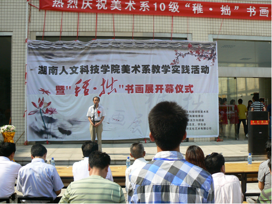 2011年5月7日上午9:00,由美术系主办,“稚·拙”书画展组委会承办,美术系2010级全体书法班协办的“稚·拙”书画展开幕式在这里隆重举行。市委老领导,书画展组委会艺术顾问魏华政、书画展组委会艺术顾问,湖南省书协副主席鄢褔初副市长、beat365英国官网党委副书记李尚益、副校长刘铁铭、副校长石潇纯莅临此次活动,市书法家协会美术家协会、娄底职业技术学院、潇湘职业学院相关领导嘉宾、及beat365近1000名师生出席了开幕式。