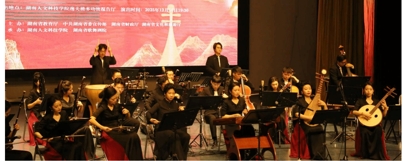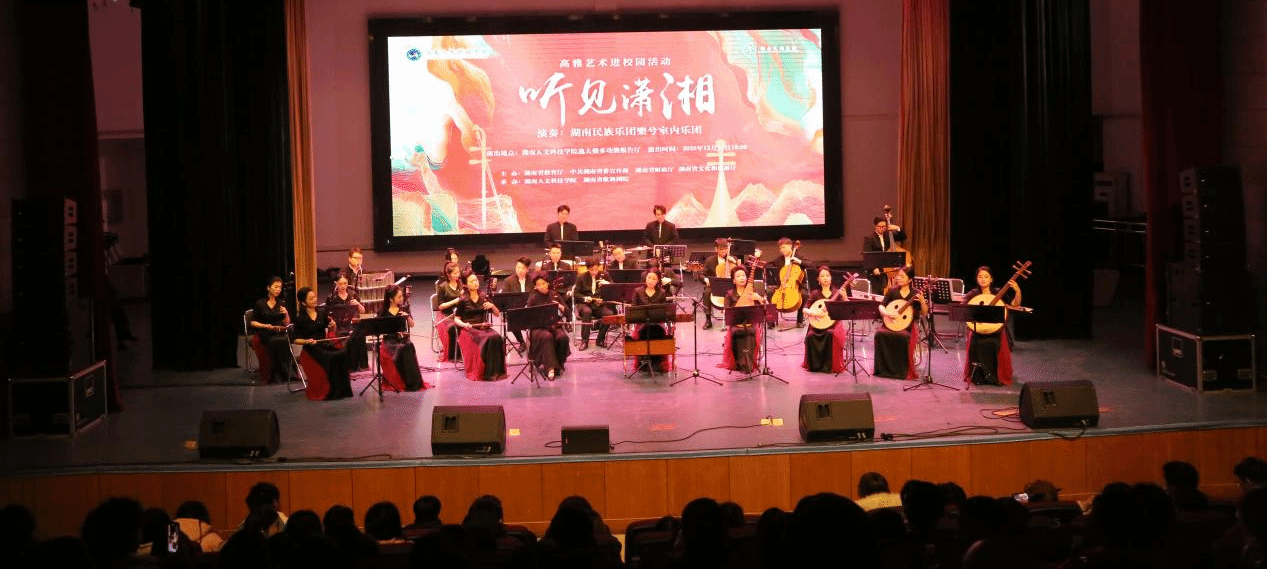 12月10日晚,由湖南省教育厅、中共湖南省委宣传部、湖南省财政厅、湖南省文化和旅游厅联合主办,beat365英国官网和湖南省歌舞剧院承办的高雅艺术进校园活动在逸夫楼多功能报告厅开展。湖南民族乐团樂兮室内乐团20余位演奏家倾情演绎。校党委委员、副校长刘铁峰,校党委委员、副校长谭峰亮,湖南民族乐团团长曹鹏出席活动。全校600余名师生观看了表演。
