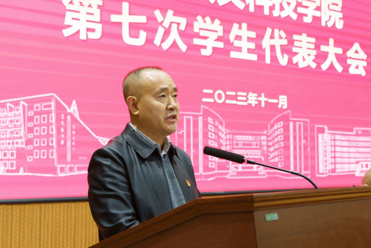 11月18日上午,beat365第七次学生代表大会在匠成楼报告厅顺利召开。党委委员、副校长刘铁峰出席开幕式并讲话。学生工作处、团委、武装保卫处等部门负责人,各二级学院团总支书记和207名学生代表参加大会。校团委副书记刘佳主持。