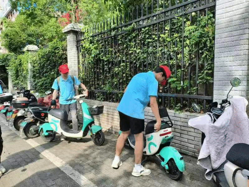 (志愿者调整乱摆共享单车)