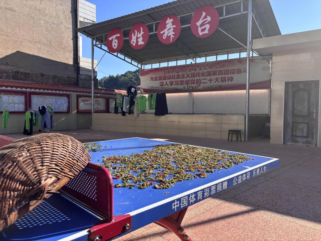 (村民在百姓舞台前晾晒农作物)