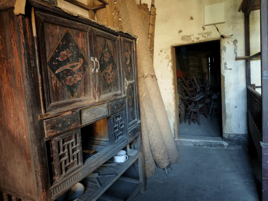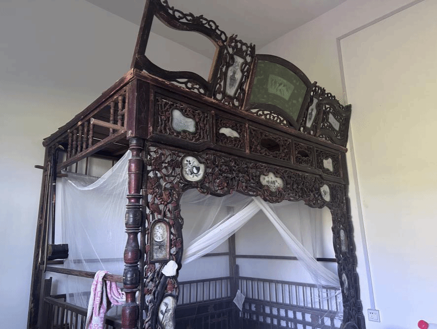 在村内,队员们惊喜地发现了许多历史悠久的老物件。每一件老物件都承载着一段故事,诉说着灌溪村的发展与变迁。其中,有一张凌波床,已有百年历史。志愿者们了解到,凌波床出现于清朝末期,兴盛于20世纪中期,以玻璃装饰和雕刻工艺著称,兼具实用性与艺术性。雕花木架、四角立柱,顶部设防尘板、玻璃片,饰以喜鹊、梅花等吉祥图案。其名称来源于床上装有的铃子与玻璃片,摇动时发出声响。另外还有一张花鸟纹碗柜,因柜门绘有花鸟图案而得名,下部带有镂空雕花装饰,兼具收纳和装饰功能,是旧时家庭存放碗、碟、杯盏的家具。