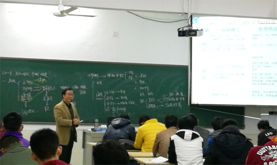 朱连池老师首先以提问的方式回顾了蜗杆传动的正确啮合条件,温习与巩固了前期所学的知识点,为本堂课重难点内容的讲解奠定了基础。紧接着,朱老师从机械的实际应用和设计切入,详细地讲解了蜗杆传动的失效形式、设计准则、材料选择以及受力分析等内容,其中重点讲解了蜗杆传动的主要失效形式——胶合,又以发生胶合现象的原因、现象和后果为切入点分析了制造蜗轮蜗杆材料的选择方式及其原因,然后结合“材料力学”讲解了蜗杆传动的受力分析等内容。朱老师课程准备充分,课件层次分明,教学过程结合工程实例、深入浅出,调动了同学们的学习兴趣。