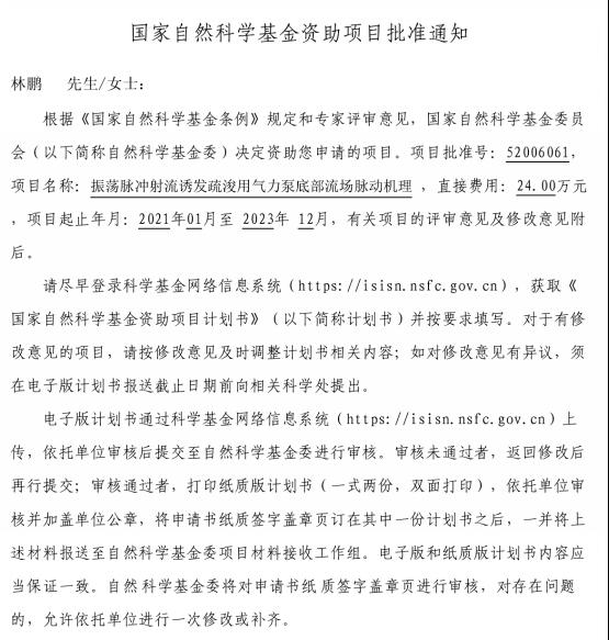 [水射流技术创新团队]我院林鹏博士喜获2020年度国家自然科学青年科学基金项目立项资助