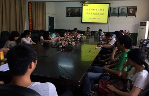2015年5月28日下午,我系在若谷楼会议室召开了2015届毕业生党员座谈会。系党总支书记谭甲凡主持会议,党总支副书记刘宗良、学生党支部书记和2015届毕业生党员出席。