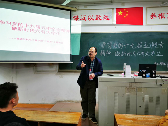 为深入学习贯彻党的第十九届五中全会精神,增强“四个意识”、坚定“四个自信”,激励同学们担当作为,奋发进取,把思想和行动统一到五中全会重大决策部署上来,2020年11月11日,能源与机电工程学院团总支召开了“学习党的十九届五中全会精神,做新时代‘六有’大学生”三联系主题班会。校党委委员、宣传统战部部长谢柳,校地校企合作处处长黎建辉、副处长周卫军,创新与创业学院副院长刘盛愚,能源与机电工程学院党总支书记彭辉、院长谢常清、副书记伍铁斌,2020级各班班主任老师、全体辅导员、学生干部代表等分别到相应“三联系”班级进行了指导。